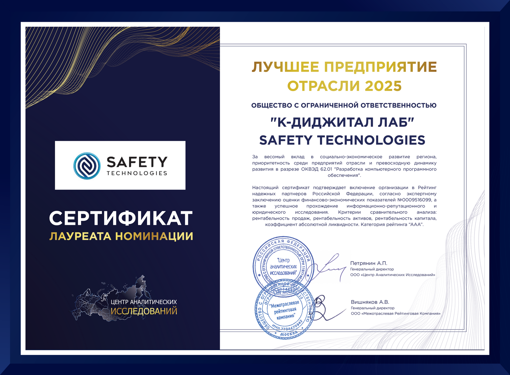 В 2025 году компания SAFETY TECHNOLOGIES (ООО «К-Диджитал Лаб») включена в «Рейтинг надёжных партнёров 2025» по России и г. Москве, а также в перечень устойчивых и динамично развивающихся предприятий по итогам экспертно-сравнительного анализа Центра аналитических исследований